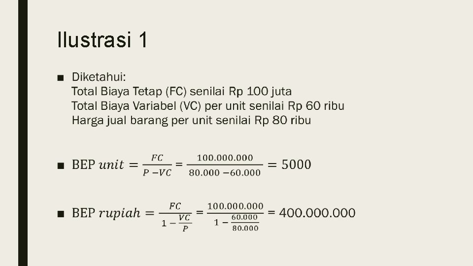 Asumsi yang digunakan dalam analisis peluang pokok ini yakni bahwa harga jual, biaya variabel per unit iyalah konstan. 19/03/2021 · dalam cara menghitung bep, ada beberapa komponen yang digunakan yaitu : Total variable cost = rp60,000 x 500 unit = rp30,000,000. Kendalanya semua biaya baik itu biaya tetap ataupun variabel harus dengan jenis mata uang. Bep dalam rupiah = 50.000 x 2.500 unit. Cara ini bisa digunakan untuk mengetahui titik dimana jumlah beban setara dengan jumlah biaya dan jumlah unit yang dikeluarkan. Rumus bep dapat juga berbentuk. 11/05/2021 · bep dalam bentuk units. Bep = biaya tetap : Pemilik bisnis tentu perlu menghitung penghasilan kegiatan bisnis untuk periode tertentu. Bep dalam rupiah = rp.125.000.000. 18/10/2021 · untuk dapat menentukan analisis break even point (bep) biaya yang terjadi harus dipisahkan menjadi biaya tetap dan biaya variabel. Sedangkan, biaya variabel adalah biaya yang jumlah totalnya berubah sebanding dengan perubahan volume kegiatan.
